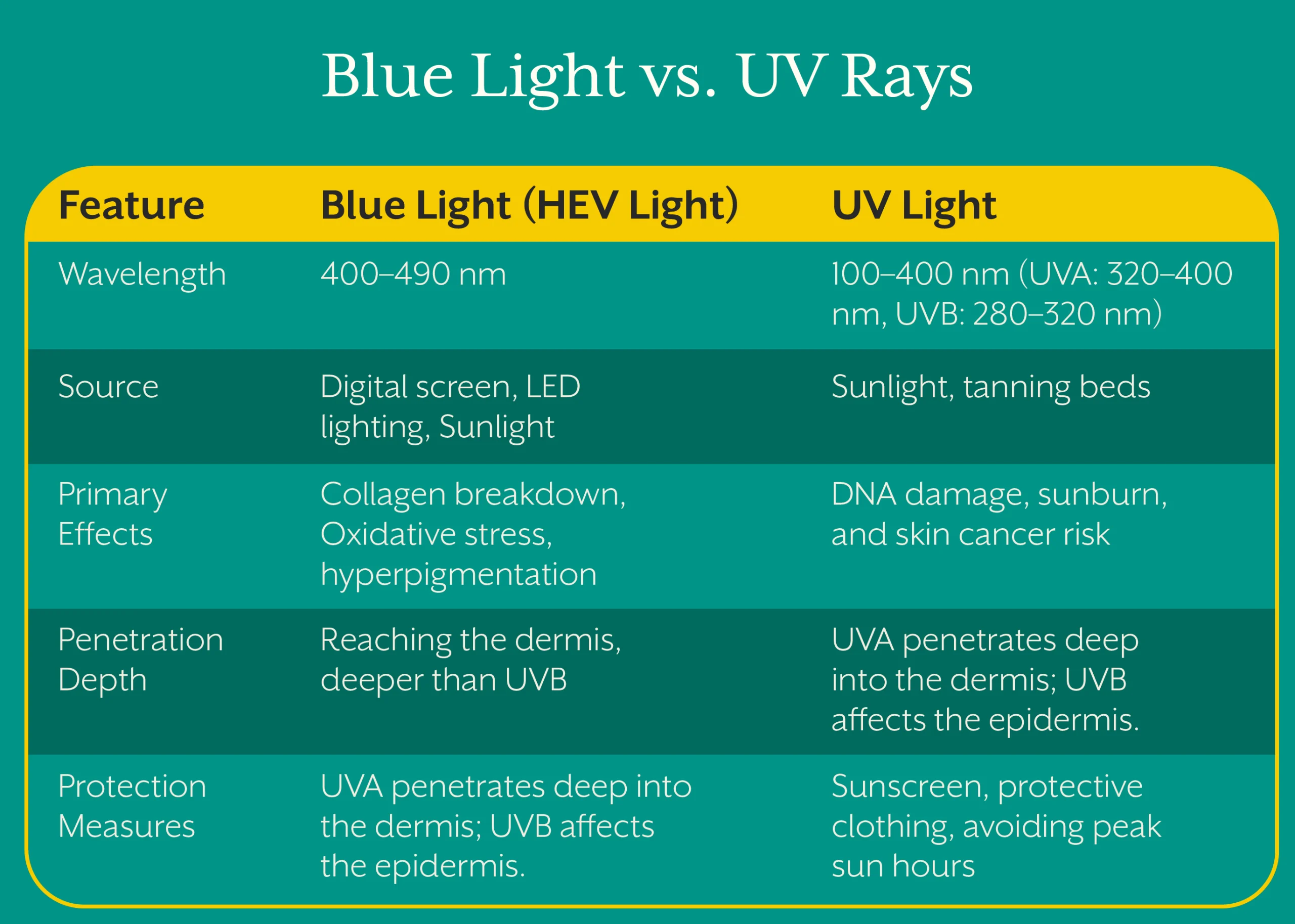 Fact: It’s less intense. The concern is the chronic, close-range, all-day-long exposure we weren’t designed for. Cumulative damage is the real issue. - Myth: If I wear sunscreen, I’m 100% protected from blue light.